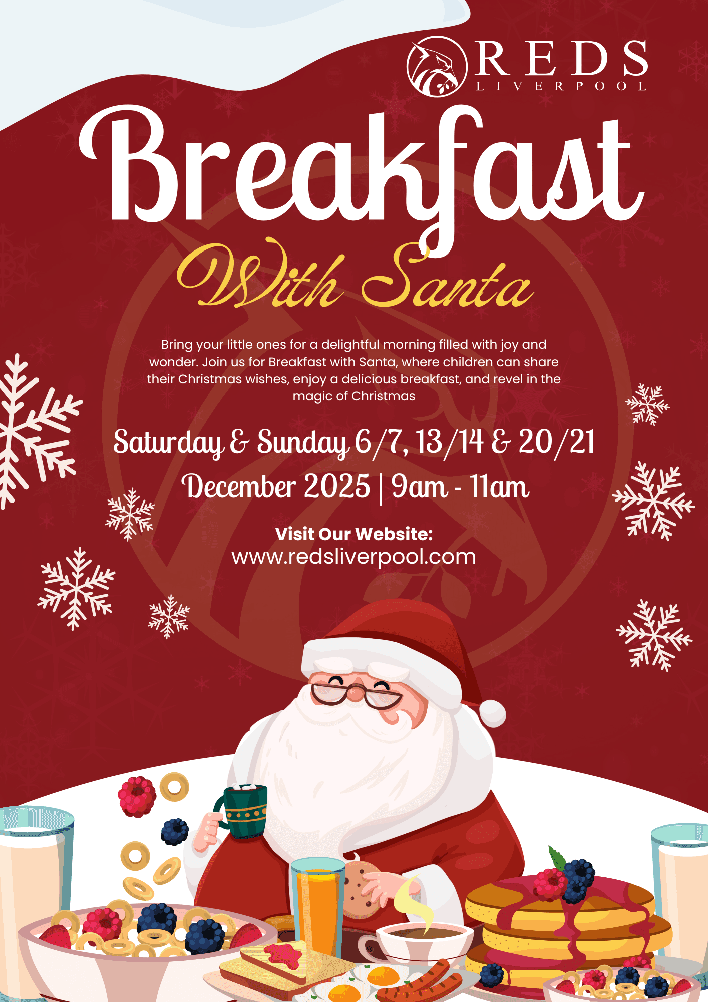 Bring your little ones for a delightful morning filled with joy and wonder. Join us for Breakfast with Santa, where children can share their Christmas wishes, enjoy a delicious breakfast, and revel in the magic of Christmas